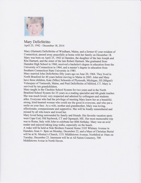 Mary and I caught up when she was planning one of the reunions. We stayed in touch for a while and exchanged Christmas cards for several years. She was always so much fun to be around in high school and it was wonderful to become reunited after such a long hiatus. But we reconnected as if no time had ever passed.My deepest condolences to Joh, her children and her beloved grandchildren. Rest in peace, Mary.